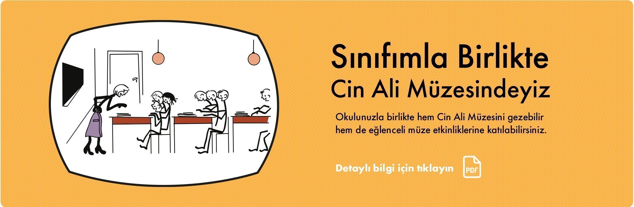 Cin Ali Müzesi okul öncesinden başlayarak tüm ilköğretim sınıfları için etkinlikli müze gezileri planladı. Müze gezinizi planlamak ve programlarımıza göz atmak için Cin Ali Müzesi Okul Gezileri bilgi formunu inceleyebilirsiniz.